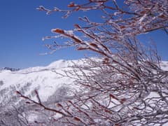 ここからは広い雪稜をゆるゆると登る散歩コースだ。豪雪地帯の山らしい二重山稜のような地形も見られる。昨晩の冷雨がブナの梢に凍り付き、鈍く銀色に光って綺麗だ。