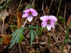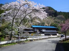 あとは谷間の林道をてくてく下る。春らしく、足元にはネコノメソウやミヤマカタバミ、ニリンソウなどが咲いている。数軒の民家を過ぎ、道端のエイザンスミレの群落を見ながら簡易舗装の急坂を下ると、落合橋はすぐだ。