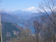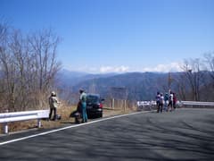 もう1台の車に乗り合わせ、林道小平座間線をつづら折れに登って、丸山の肩の林道最高点まで上がる。この林道は舗装されているが落石が多く、運転注意。最高点からは草木湖や白浜山、男体山の展望が開ける。サイクリングの一団も上がって来ていて、車でも長くてちょっと嫌になる林道だが、その筋の人には“楽しいコース”だそうだ(^^;)