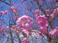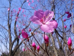 十二時山から西へ、雑木林の稜線を緩く下って鹿生峠に向かう。前回、同時期にこの稜線を歩いた時(山行記録)はアカヤシオが咲いていたので、今回も期待していたら、果たして咲き始めていた。ただし、今年は春先も寒い日が続いたせいか、まだ2分咲き程度。