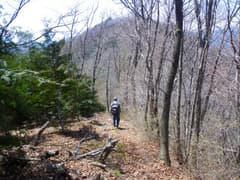 鹿生峠からさらに稜線を西へ進む。ここからが未踏の区間になる。今回のコース唯一の急登で865m標高点を越え、明るい雑木林の稜線をゆるゆると下る。標高が下がったこのあたりのアカヤシオは、ちょうど満開だ。なかなか良い場所だなあ。