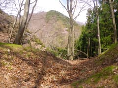 峠の陽当たりが良い小平地は、休憩にうってつけ。時間は少し早いが、ここでビール&昼食とする。前回はここから峠道を北側に下った。出だしは相変わらずはっきりとした道型が残っているが、その先は廃道化している。一方、南側は伐採跡地の谷間を藪が埋めており、改めて探しても峠道の痕跡はなさそうだ。
