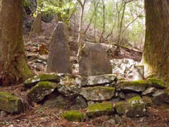 小夜戸峠から小友への下り始めは杉の植林で、峠道の痕跡は全くない。すぐに作業道に出てしばらく下ると、「右山道、左小夜戸道」(道の字は共通)と刻んだ道標があるから、ここが峠道だったことは確かだ。傍らには百番供養塔と猿田彦大神の石碑も祀られ、2本の杉の大木に守られて神さびた雰囲気がある。