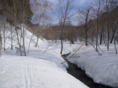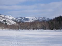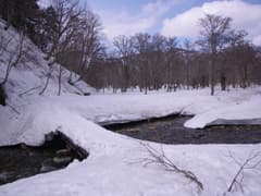 鳩待峠から山ノ鼻への下りも雪が多く、昨年は雪がなくて露出していた川沿いの木道部分も、今年は川自体が雪に埋もれていて、滑って通過できる。山ノ鼻手前の川上川に架かる橋の上にも雪が厚く残っている。