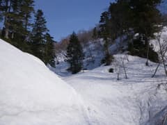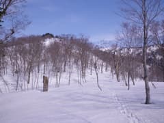 二か所ある猫又川の高巻きも、残雪が豊富で楽に通過。入山者が多いようで、トレースが沢山ある。二俣にはテントが一張りあった。左俣に入り、次の二俣の正面の尾根が登路だ。ここで一休みし、テレマークにシールを張る。尾根の突端にはつぼ足で降りた跡があるが、ほとんど崖に近く、登るのは難しい。左の谷を少し遡ったのち、戻るように山腹をトラバースして尾根に乗る。
