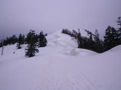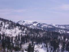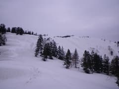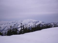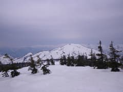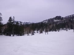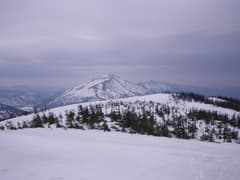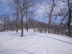 主稜線は幅広く、さらに膨大な残雪に覆われている。樹林は疎らで傾斜は緩く、シール登高が楽しい。しかし、主稜線に登り着いた頃から急に灰色の雲が上空を覆って、あたりは薄暗くなった。陽射しがあれば気分は最高の雪稜なんだけどなー。