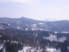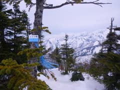 曇り空と黄砂のせい?で遠望は霞んでいるが、それでも周辺の主要な山が眺められるのは幸いだ。登る予定だった赤倉岳への雪稜もよく見えているが、これは遠いなあ。天気は段々悪くなるし、往復2時間はかかりそうなので、今回は登頂を断念して、ここから下山にかかる。