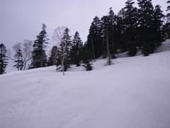 シールを外し、大白沢山の方向へ主稜線を滑る。幅と傾斜があって標高差100m。今日一番のいい斜面だ。鞍部まで滑って、大白沢山に登るつもりも少しあったが、同じ標高差を登り返すのがおっくうになってきたので諦めて、そのままワル沢左岸をトラバースして岩塔ヶ原に滑り込むことにする。岩塔ヶ原からは、昨年も滑った右俣経由で帰れるので安全確実だ。