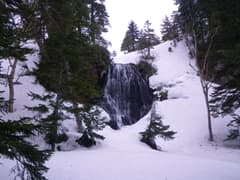 しかし、トラバースの途中に良い斜面があるとついつい滑ってしまい、標高を下げて大白沢山の南西の岩壁の上に出た。この岩壁は下れない。ここから見るとワル沢の右岸が滑れそうに見える。沢に滑り込むと、今度は滝の上に出た。後日調べると、西丸震哉氏が名付けたところのプルプル滝らしい。この滝は右岸の雪の急斜面(ほとんど崖)を滑って降りたが、この下降はヒヤヒヤものだった。