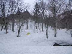 テントの外がぼんやり明るくなって、目が覚める。時刻は、と腕時計を見ると5時過ぎだ。朝食にラーメンを食べ、テレマークを履いて出発する。今日はススヶ峰と赤倉岳を登る予定で、猫又川の上流に向かう。