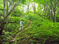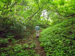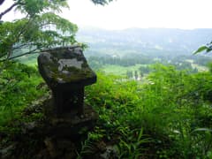 駐車場の先に続く林道を辿ると右側に小さな池があり、水面に差し掛かる梢にはモリアオガエルの白い卵塊が絡まり着いている。池の手前の朽ちた木道を渡り、樹林の中の踏み跡を登ると、幅の広い山道に出る。林道が開通する前に使われていた旧道らしい。山道を進むとすぐに峠に着き、旧道と分れて稜線上の踏み跡を辿る。樹林の緑が瑞々しい。稜線の脇に眺めの良い露岩があり、山麓の田園を見守るように苔むした石祠が祀られている。