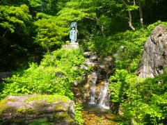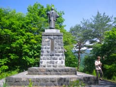 サンダル履きで、宿の横手からブナ林の中の遊歩道を登り始める。不動明王が祀られた枝沢を渡ると、展望台まであと600mと書かれた道標がある。山腹を絡んでブナ林をゆるゆると登ると、銅像の立つ展望台に着いた。銅像の銘文には「小野喜興三翁彰徳像 建設大臣 木暮武太夫 書」とある。
