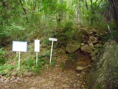 村松峠で水分を補給して一休み。ここから縦走路を外れて、村松沢を下る。この道を歩くのは久しぶりの二回目なので、なかなか新鮮な感覚がある。杉林を急降下すると、流水が現れる。出水があったのか、道は荒れ気味。やがて林道に出る。「松村峠入口」という道標があるけど、なんか違う気が。