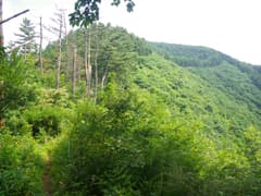 木の階段のある坂を下り、村松峠から萱野山に向かってゆるゆる登る。西方寺沢の頭の標識を過ぎると木立が切れて、行く手に縦走路の尾根が延びているのが見える。右側の斜面は西方寺沢源頭の伐採地で、雑木が繁茂している。この伐採地の雑木も年々生長して、そのうち眺めもきかなくなるだろう。