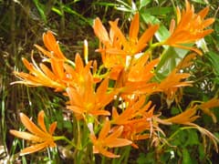 伐採地上端を横切る縦走路を辿ると、一群れのキツネノカミソリが咲いていた。この時期に咲く花があるとは期待していなかったので、ハスの花とこれが見られたのは、ちょっと嬉しい。岡平から先は雑木林に覆われた緩やかな尾根道となり、山らしい雰囲気がある。