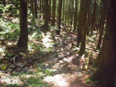 ここまでで既にたっぷり汗をかいているが、今日はリハビリが主旨なので、もうちょい足を延ばそう。鳴神山への縦走路に入ると、低山とはいえそこそこ標高があり、樹林が日光を遮るので意外と涼しい。