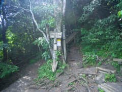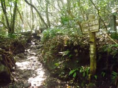 芝生の広場を通り抜け、舗装された坂道を登ると「2合目あと3.5km」の標識があり、ここから登山道が始まる。鬱蒼と茂る樹林の中の掘割のように抉れた道をゆるゆると登る。2.5合目で車道を横切り、3合目も同じような樹林の中の道が続く。円錐形の山の山腹を斜めに登るので、傾斜は緩くて楽だが、眺めもなくて、この辺りの歩きはいささか単調。