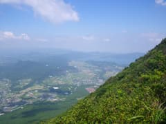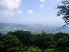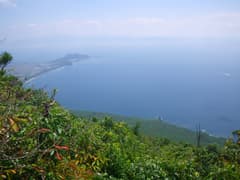 4合目を過ぎ、5合目に着くと初めて樹林の間から展望が得られ、山麓や海岸線が眺められる。ペースを上げて歩いて、さすがに疲れたので、展望を楽しみながら一休みして水分を補給する。頂上まであと2.0kmだ。