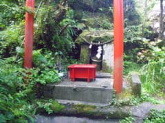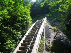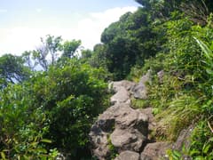 5合目からは傾斜が増し、木の階段が現れたりして、登山道に変化が付く。7合目辺りは急な山腹のトラバース道となり、転石が多い。開聞岳を180度回り込んで来て、眼下には東シナ海が見える。海の見える転石の道から再び樹林に入ると、仙人洞という説明板のある岩洞(といっても大岩の隙間)がある。かつて、山伏たちがここで修行したのだそうな。