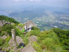 開聞岳の頂上は大岩がゴロゴロと積み上がり、高山的な雰囲気がある。急峻な独立峰なだけあって、展望は正に360度。薩摩半島を一望し、池田湖や東シナ海の眺めが良い。特に岩場の先端から山麓を俯瞰すると、標高900m余とは思えない高度感があり、爽快だ。すると頂上で休憩していた3人グループのおじさんが、そこで写真を撮ってあげましょう、と言う。鹿児島の人はなんかfriendly。