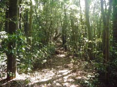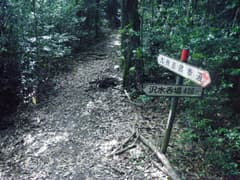 ここから大箆柄岳に登るコースは九州自然歩道の一部になっており、登山口にその案内の看板が立っている。登山道は、最初、樹林の中を緩く登る。南国の鬱蒼と茂る照葉樹林の中は、日光が遮られて薄暗い。途中、「沢水吞場400m」の道標があるが、遠過ぎるので立ち寄らずに通過する。