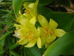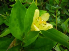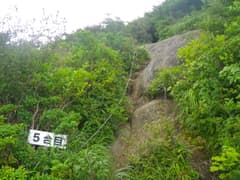 登山道はやがて傾斜を増し、ひと登りで5合目に着く。樹林が切れて、振り返ると広大な山麓の向こうに垂水市街や錦江湾が眺められる。周囲の草叢の中に黄色い花が咲いているのに気がついた。後日調べると、タカクマホトトギスという鹿児島特産の花らしい。