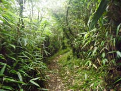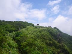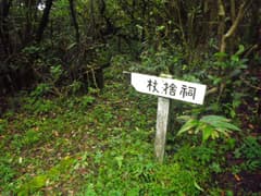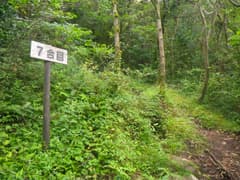 5合目の上の急坂は短く、再び展望のない樹林帯に入って、7合目付近は緩い斜面を登る。やがて、杖捨祠という標識と苔むした石祠のある地点に着く。かつての岳参りの際、この先に急な登りはないので、ここで杖を捨てたという由来があるらしい。実際、ここからゆったりとした稜線歩きとなる。しかし、背の高いスズタケが密生し、展望は全くない。