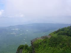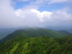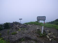 スズタケを丹念に切り開いた道を辿ると、ふいに開けた場所に飛び出して、そこが大箆柄岳の頂上だった。頂上の垂水側は岩場と急斜面で、なかなか高山的な雰囲気がある。残念ながらガスがかかり、山麓の森林が俯瞰できるだけで、遠くの眺めは得られない。