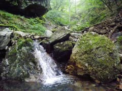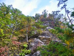 天丸橋から大山への天丸沢コースは、やはり5年前の10月末に歩いたことがある(山行記録)。そのときは紅葉終盤だったが、今日はまだ色づき始めたというところだ。10月中旬が見頃かな。沢沿いの道は、ナメ滝を高巻く個所があるなど、変化に富んでいる。