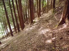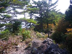 稜線を進むと岩稜が現われ、しばらく岩稜の右側を巻いてトラバースする。一部、ルートがわかりにくい。しばらく平坦な稜線が続き、このあたりが焼山のピークらしい。やがて右に折れて、山吹峠に向かって非常に急な坂の下りとなる。今日は幸い地面が乾いているから滑ることはないが、雨上がりなど状況によっては危ない道だ。