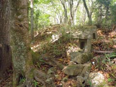 途中、傾斜が緩むが、再び急坂となって、一気に山吹峠に下る。山吹峠には小さな石祠が祀られ、稜線を南北に越える峠道がある。路傍の岩に腰を下ろして、小休止。峠を吹き抜ける風が冷たく、Tシャツではちょっと寒い。