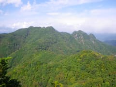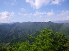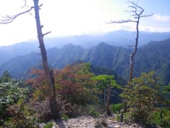 最後は頂上直下を巻き、反対側の稜線から頂上に登る。頂上は木立のある北面の一部を除いて三方が開け、鋭峰の天辺だけあって好展望が得られる。西側は焼岩や上武国境稜線の帳付山、滝谷山、南側は滝谷山から南天山に連なる稜線が、遮るものなく見える。南天山の奥に霞むなだらかな高山は、三宝山辺りの奥秩父の山並みのようだ。展望を楽しみながら缶ビールをあけ、ラーメンを作って昼食にする。
