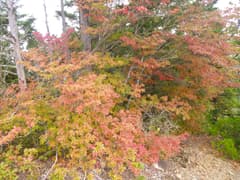 稜線に出ると、紅葉が少し進んで赤い葉が目立つ。東側には焼岩や大ナゲシ、赤岩岳、両神山などの岩峰群が雲海に浮かんでいる。これはなかなか素晴らしい眺めだ。