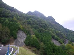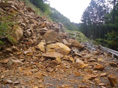 林道に降りて直ぐ左側、天丸トンネル方向の車道を見てビックリ。法面が大規模に崩落し、大量の岩石と鉄筋が飛び出たコンクリート塊が道路を埋め尽くしている。この様子では、復旧は当分の間なさそうだ。