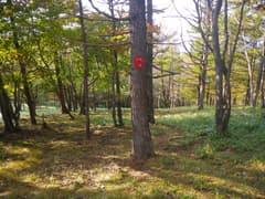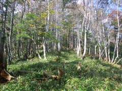 やがて広く緩やかな尾根の上に出る。ダケカンバの疎林に入ると道型が不鮮明になり、登りは問題ないが下りでは迷いそうだ。Mさんもここの下りで迷ったことがあると言う。尾根の上部でようやく紅葉が始まる。モミジ尾根はやはり雰囲気がいいなあ。