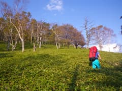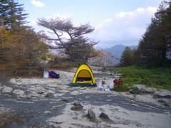 折れて「…山」だけになった山名標のある日向山を越え、カモシカ平へ下る。カモシカ平は白砂の平地のある鞍部で、テン場適地だ。早速、Mさんの軽量ゴアテントを設営し、水場へ水を汲みに行く。水は栃木側へ笹原をちょっと下ったところの小さな沢から得られる。