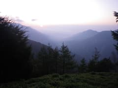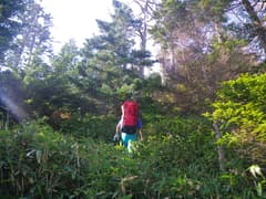 夜明け前に起床。朝は食欲が出ないので、簡単にパンで朝食を済ます。薄雲が広がっているが、天気の心配はなさそうだ。朝焼けの中、濡れた靴下と靴にイヤイヤ足を突っ込んで出発。笹に朝露がグッショリついていて、しかもほとんどないに等しい踏み跡を辿るので、濡れないように下ゴアを履いて歩く。