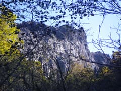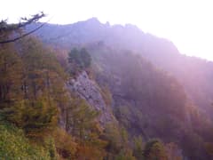 カマ五峰への登りにかかると、稜線の右側は松木渓谷を見おろす断崖絶壁となる。この辺りの紅葉はなかなか綺麗だ。カマ五峰の最高点は岩峰で、その左の肩を目指して登る。逆コースの場合、肩から間違って最高点へ直進すると、断崖絶壁の上に出る。肩から右に折れなければならない。