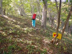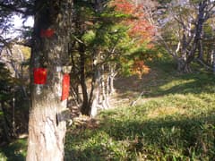 ここから急傾斜の山腹をジグザグに登る。標識はあるが、道型は微かで一般登山道とは言い難い。残念ながら、紅葉はちょっと時期が早かったようだ。前回は鹿の鳴き声を盛んに聞いたのだが、今回は静かだ。