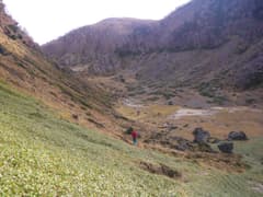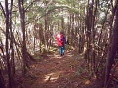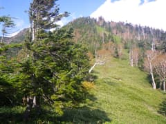 頂上から窪地へは道がない。低い笹と苔の樹林を適当に下って行くと急斜面に行きあたったので、進路を左に振って白根山との最低鞍部の辺りに降りる。