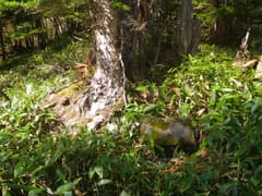 宿堂坊山からひと下りすると、笹原に深く覆われたネギト沢の水場(コル)に着く。大きなダケカンバの根元に、苔むした石祠が祀られている。これは室町時代の日光修験の遺物で、長らく存在が知られていなかったが、Mさんも探索に関わって発見されたものだそうだ。歴史的に貴重な祠だ(参考記事)。