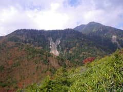 ここから笹原とダケカンバ林の緩く長い登りとなる。展望に乏しい樹林の尾根が続くが、2077m標高点に登ると展望が開けて、行く手に錫ヶ岳の大きな山容が現れる。これはなんとか錫ヶ岳を越えて、錫の水場まで届きそうだな。県境稜線西面の泙川(ひらかわ)源流域も一望できて、いい感じに色づいた樹林が美しい。