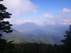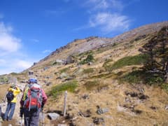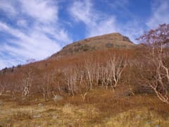 まだ午前の早い時間なのに、もう頂上から降りて来るハイカーさんとたくさんすれ違う。話を聞くと、菅沼から登って来たとのこと。ダケカンバ林は既に葉を落として、この辺りは晩秋の雰囲気だ。森林限界を超えると五色沼や、女峰山、男体山の日光表連山が眺められる。丸沼からの合流点の祠にザックをデポし、空身で山頂に往復する。