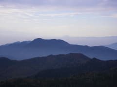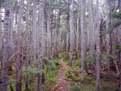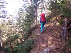最終日の行程は短いので、二度寝してのんびり起きる。パンを食べて出発。今日は雲が広がる天気だ。足元を苔が覆うシラビソ林が続き、高山的な雰囲気が奥秩父の山に似ている。断続的に現れる笹原では、四方の眺めが開ける。2000mを越える稜線の上なので、風に当たるとさすがに寒い。