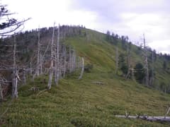 笹原と立ち枯れのシラビソの尾根を緩く登ると、白根隠山西峰(白檜岳)の頂上に着く。登山道はこの先の白根隠山を越えて五色沼避難小屋に通じているが、ハイトスさんが錫ヶ岳の記事で、白根山と白根隠山の間の窪地を歩いていることを思い出し、窪地に下ってみることにする。