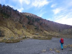 下り着いた窪地には木立が全くなく、不思議な景観が広がる。いつの間にか薄雲が消えて、青空の中に白根山がごつごつと聳えている。避難小屋まで行かず、その手前で登山道に合流して、白根山への登りに取り付く。