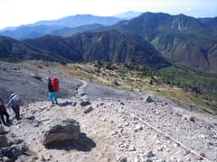 展望を楽しんだのち、祠でパンを齧って、丸沼へ下山にかかる。砂礫の斜面を降り始めてビックリ、下から続々とハイカーさんが登って来て、その列は途切れない。すれ違いで待つこともしばしばだが、まあ時間は余る程あるので、のんびり下る。
