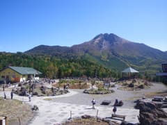 樹林帯に入り、山腹を横切りつつ高度を落とす。途中の地獄ナギから見上げた白根山は、巨大な岩壁を峙てて迫力だ。やがて傾斜が緩くなり、ロープウェイ山頂駅から一周する散策コースに合流する。軽装で散歩するハイカーさんが多い。山頂駅までは、あと僅かの距離だ。