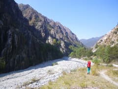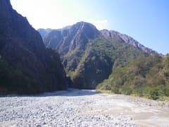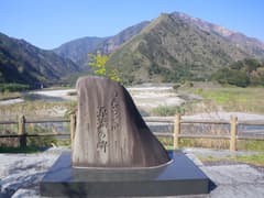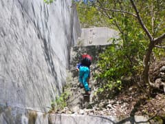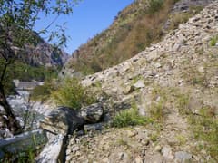 旧松木村のはずれに二つ目のゲートがあり、その先は荒れた林道となる。あちこちで法面が崩壊し、大量の土石が道を埋めている。1997年に来たときは、もう少し良い道だった記憶があるのだが、荒廃が著しい。河原の土砂も嵩を増している気がする。対岸の支流はいずれも険谷で、石塔尾根の稜線から一気に落ち、岩壁を割って本流に流れ込む。