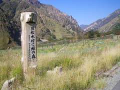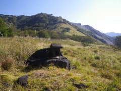 足尾銅山の堆積場を過ぎ、山裾に緩斜面が開けた地点に差し掛かると、道端に三基の墓石がある。この辺りがかつての松木村の集落の跡だ。その少し先には岩根の上に石祠が祀られ、文化九(1812)年三月吉日との銘が読める。現地の説明板によると、松木村は、江戸時代後期には37戸170人もの村人が小麦、豆を作り、養蚕を営んで住んでいたそうだが、足尾銅山の稼働後は伐採、煙害、山火事によって森林が荒廃し、わずか数年後には廃村になったそうだ。